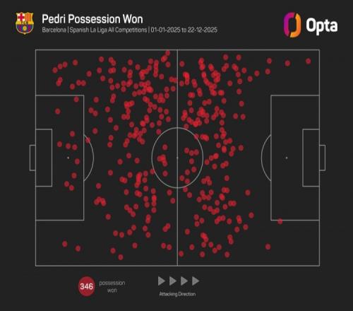 数据统计显示,佩德里在2025年各项赛事共计346次夺回球权,是五大联赛同期非门将球员最多。
