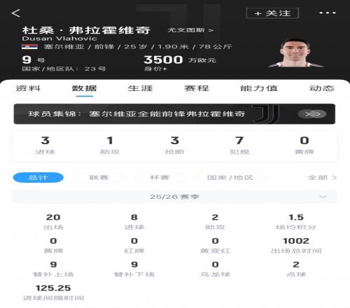 报道称,巴萨已经采取行动,以争取得到尤文的弗拉霍维奇。球员的合同将于2026年6月到期。