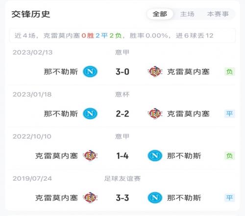 本场赛前,克雷莫内塞5胜6平5负积21分,排名意甲第12;那不勒斯10胜1平4负积31分,排名意甲第4。双方近两场意甲交锋,那不勒斯进7球仅丢1球,保持全胜。
