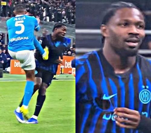 第二件事,就是在网友当中争论较多的小胡安飞踹小图拉姆事件,抬脚过高首先至少是一张黄牌;而小胡安却又在空中不收脚,反而二次发力有力量的蹬了出去,直接把小图拉姆的球衣都蹬破了;那么从慢动作来看,这不但应该是一张直红的动作,而且应该被判定为违反体育道德的球场暴力行为,赛后应该被追加停赛处罚的;但主裁判判罚的是掷边线球,直红动作在这里居然连犯规都不是;同样,赛后意大利媒体圈,没有任何人提及此事,是任何人。