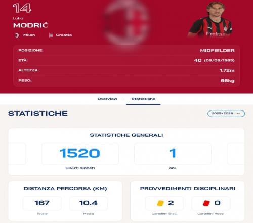 40岁莫德里奇本赛季在米兰场均跑10.4公里,传球成功率高达91%