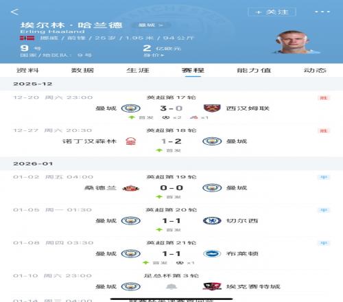 圣诞节前,哈兰德2射1传助曼城3-0击败西汉姆,而在圣诞假期后,哈兰德4轮比赛17次射门6次射正,仅打进1粒点球,错失2次良机。
