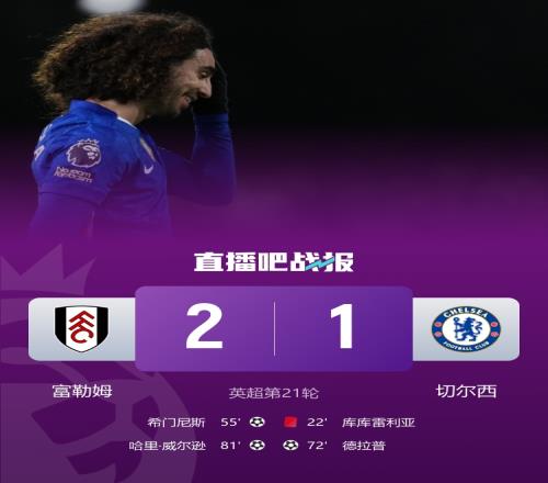 体育播报1月8日宣 英超第21轮,富勒姆坐镇主场克拉文农场球场迎战切尔西。上半场,库库雷利亚直红被罚下,威尔逊破门被吹。易边再战,希门尼斯打偏僵局,德拉普处子球扳平,威尔逊进球富勒姆再次领先。最终富勒姆1-2十人切尔西。积分榜方面,切尔西31分第六,富勒姆31分第八。