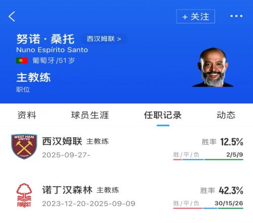 努诺本赛季在诺丁汉森林下课后,开始执教西汉姆联,带西汉姆联16场比赛里2胜5平9负,胜率只有12.5%,近10轮英超不胜。