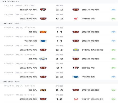 西汉姆联近10轮英超无一胜绩