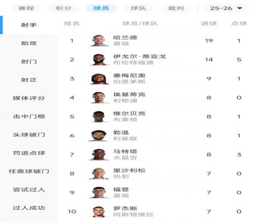 whoscored2025英超最佳阵:哈兰德、B费领衔,范戴克、赖斯在列