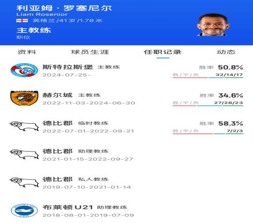 41岁的罗塞尼尔球员生涯曾效力布莱顿、赫尔城、富勒姆等球队,2024年夏天成为斯特拉斯堡主帅并执教至今。他曾是鲁尼在德比郡的助教。
