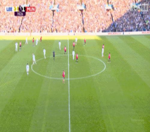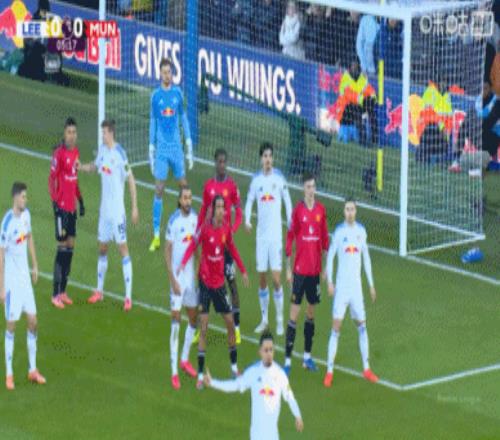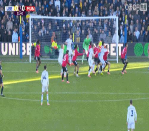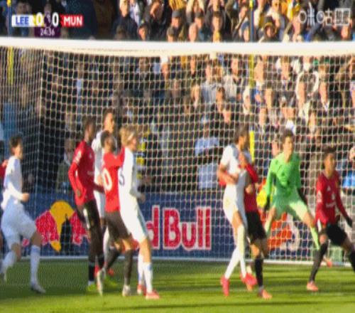 第35分钟,利兹联右路传中,前点勒温甩头攻门!皮球击中后侧立柱!曼联逃过一劫↓