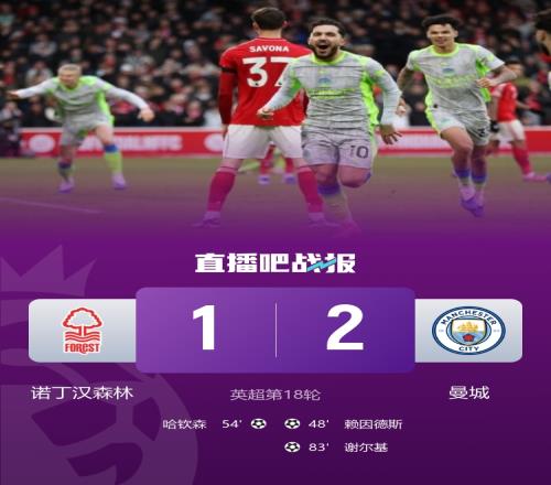 各赛事8连胜!曼城2-1诺丁汉森林 谢尔基传射建功赖因德斯破门