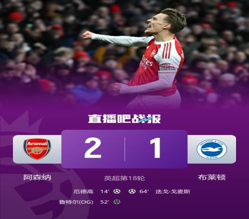 阿森纳2-1布莱顿继续领跑,厄德高打进自己本赛季的首个进球。