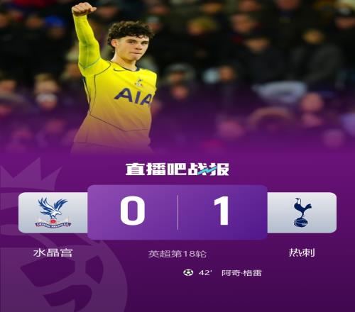 体育播报12月29日宣 北京时间12月29日0点30分,英超第18轮,水晶宫在主场塞尔赫斯特公园球场迎战热刺。上半场,里沙利松进球被吹,格雷头球破门。下半场,德文尼错失良机,里沙利松破门再度被吹,奥多贝尔射中立柱。最终热刺1-0击败水晶宫。本场比赛过后,热刺积25分,排在第十一名,水晶宫积26分,排在第九名。