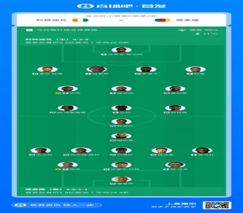 体育播报12月29日宣 非洲杯小组赛F组第2轮,科特迪瓦主场迎战喀麦隆,赛前双方首发公布。