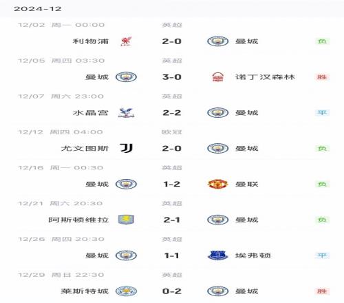 曼城去年12月战绩