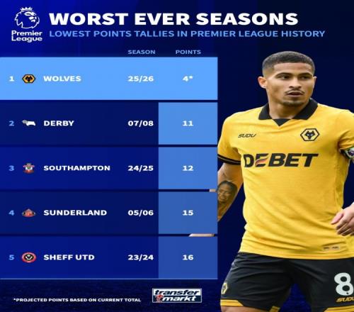 1. 狼队(25-26赛季),-29净胜球,2分