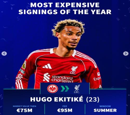 埃基蒂克(23岁):法兰克福→利物浦,身价7500万,转会费9500万