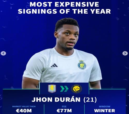 杜兰(21岁):阿斯顿维拉→利雅得胜利,身价4000万,转会费7700万