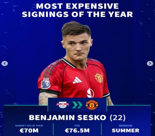 舍什科(22岁):莱比锡→曼联,身价7000万,转会费7650万