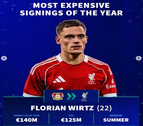 维尔茨(22岁):勒沃库森→利物浦,身价1.4亿,转会费1.25亿