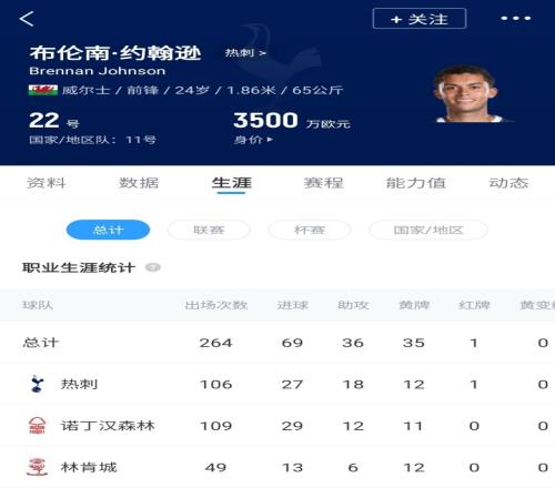 2023年夏窗,布伦南·约翰逊以5500万欧转会费从诺丁汉森林加盟热刺,本赛季球员为热刺出战22场比赛,打进4球,德转身价3500万欧。