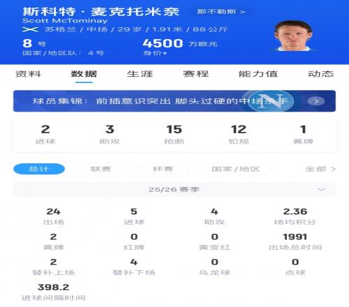 麦克托米奈现年29岁,他2024年夏从曼联以3050万欧转会那不勒斯,合同至2028年,他目前的身价为4500万欧。