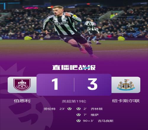 体育播报12月31日宣 英超第19轮,伯恩利坐镇主场特夫摩尔球场迎战纽卡斯尔联。上半场,乔林顿、维萨连入两球,劳伦特扳回一城,沙尔门线解围。易边再战,汉弗莱斯也是门线解围,吉马良斯补时锁定胜局。最终伯恩利1-3纽卡。积分榜方面,纽卡26分暂升第九,伯恩利12分倒二。