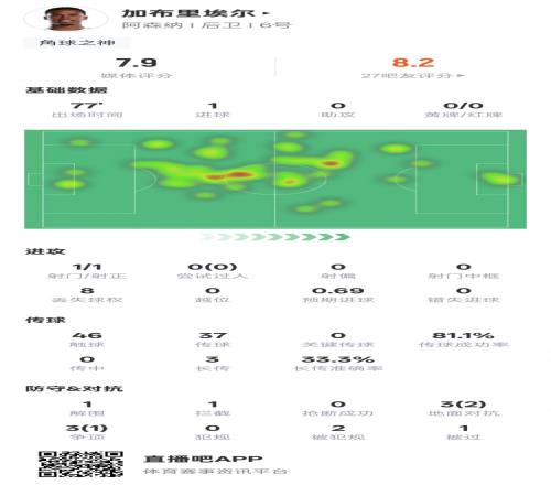 加布里埃尔本场比赛数据:1进球1解围1拦截,评分7.9