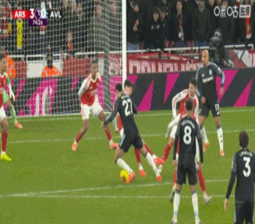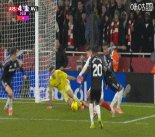 第90+4分钟,马伦禁区左侧个人能力的突破下底横传穿了拉亚小门,沃特金斯吃饼进球!阿森纳4-1维拉↓