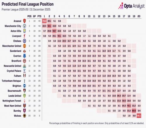 opta预测英超夺冠概率↓