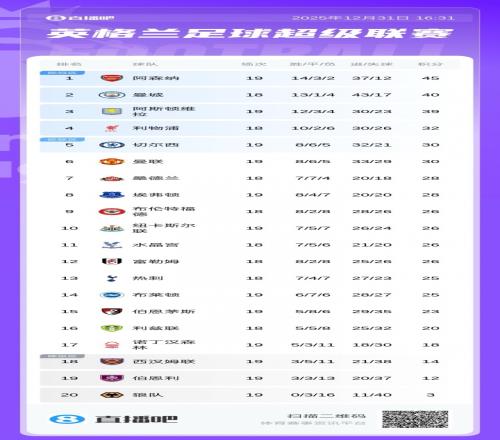 体育播报12月31日宣 2025年英超比赛结束,半程过后,枪手领跑英超积分榜。