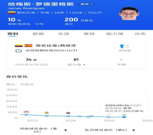 自2020年起,J罗已经辗转过皇马、埃弗顿、赖扬、奥林匹亚科斯、圣保罗、巴列卡诺、莱昂7支球队。目前34岁的J罗德转身价为200万欧元。
