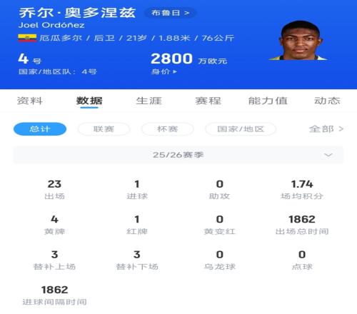 21岁的厄瓜多尔中卫乔尔·奥多涅兹,本赛季代表布鲁日出战23场比赛,出场时间1862分钟,是球队的绝对主力,目前德转身价2800万欧元。国家队层面,奥多涅兹已经代表厄瓜多尔出战14场比赛,是球队世预赛的主力中卫。