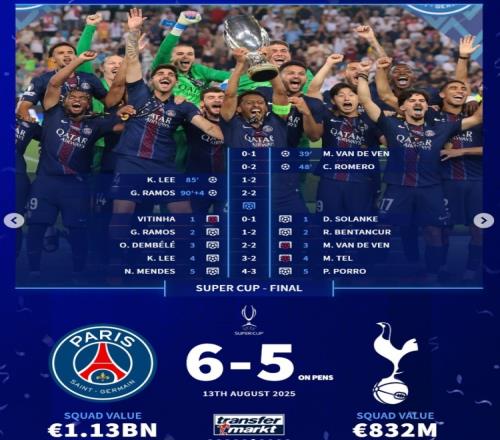 欧超杯:巴黎2-2热刺,点球4-3、总比分6-5