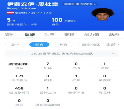 17岁的恩杜奎目前效力于奥地利维也纳B队,场上司职中卫,目前他的德转身价为100万欧元。