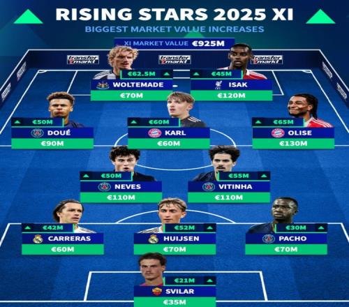 德转列2025身价上涨阵:维蒂尼亚领衔巴黎4将,皇马、拜仁各2人