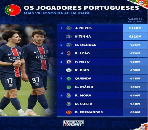 葡萄牙球员身价榜:内维斯、维蒂尼亚1.1亿欧居首,门德斯7500万