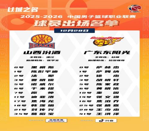 体育播报12月28日宣 CBA常规赛今晚上演晋粤大战,山西主场迎战广东。赛前大名单出炉,胡明轩在其中,张宁缺阵,具体...
