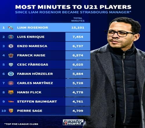 善用小将,罗塞尼尔执教斯特拉斯堡以来使用U21球员时间大幅领跑