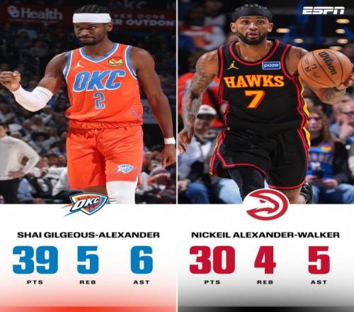 NBA常规赛,雷霆140-129击退老鹰。表哥亚历山大24中15,三分5中2,罚球7中7砍下39分5篮板6助攻2抢断;表弟亚历山大-...