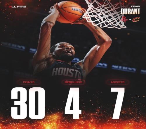 本场最佳!火箭发布杜兰特本场数据海报:30分4篮板7助攻