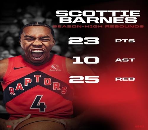 斯科蒂巴恩斯爆抢25篮板追平比永博保持的猛龙队史纪录