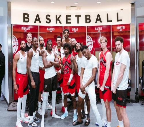 击退勇士!猛龙球员更衣室拍全家福庆祝胜利巴恩斯获戴大金链子