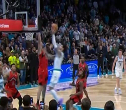 NBA常规赛,猛龙客场挑战黄蜂,末节最后20.1秒时巴雷特上篮打进,两队战成94平。黄蜂进攻回合,拉梅洛·鲍尔杀入篮...