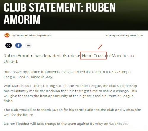 最后也没能如愿!曼联解雇阿莫林公告,用的还是coach不是manager