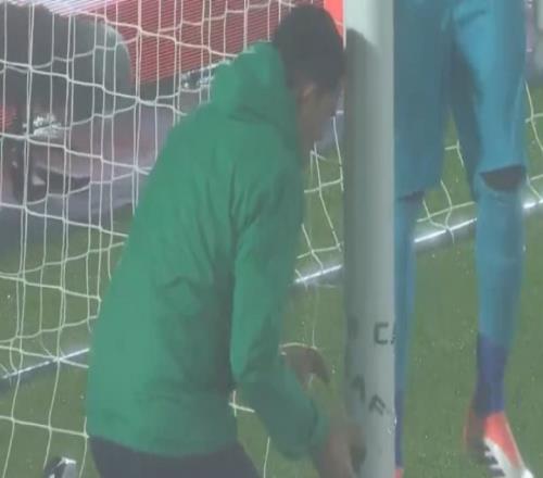 凑合着先用吧非洲杯莫桑比克队球网破了个洞,官方用胶带修补