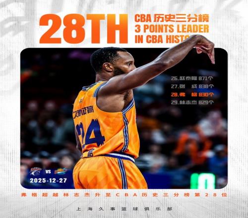 弗格生涯三分命中总数达到830个超越林志杰升至CBA历史第28位