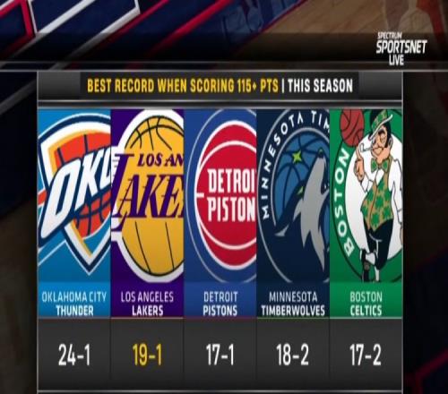 本赛季湖人得分115+球队战绩为19胜1负全联盟仅次于雷霆!