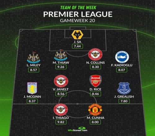 体育播报1月5日宣 WhoScored列出了英超第20轮最佳阵容,库尼亚、赖斯、格拉利什在列。WhoScored英超第20轮最...