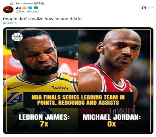 詹姆斯总决赛得分&篮板&助攻7次领跑全队&乔丹0次自媒体:太荒谬