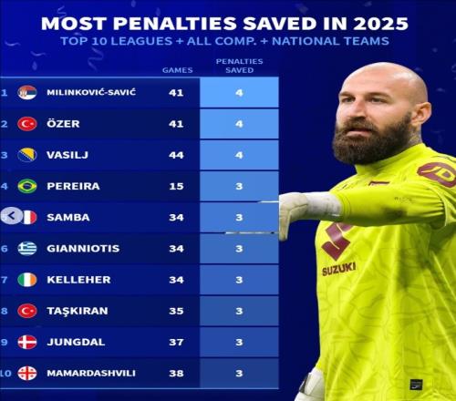 体育播报1月7日宣 德转统计了2025年有关点球的数据,以下是2025年门将扑点次数的排行榜。统计仅限于2025年前1...