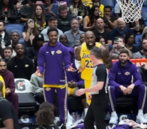 詹姆斯后仰打到篮板上沿布朗尼不满起身和父亲一起质问裁判